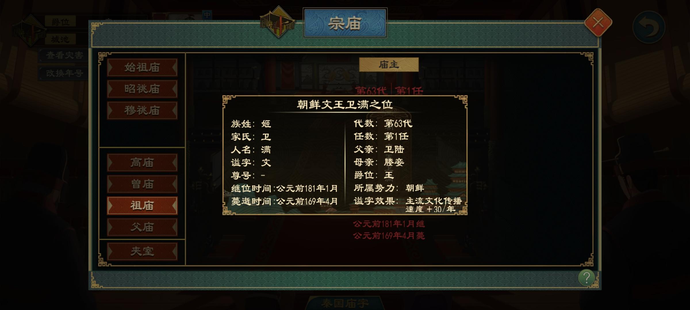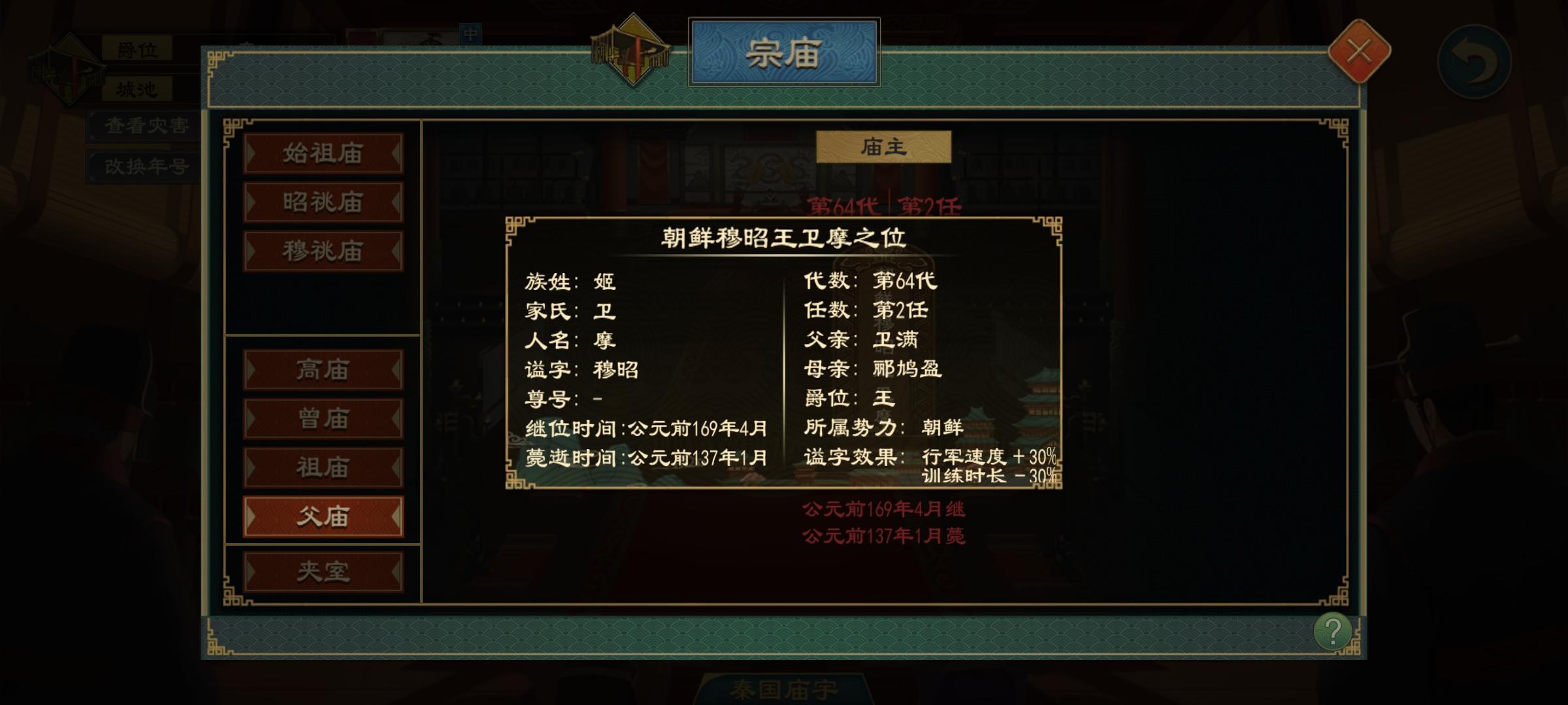 文王卫满在位12年,虽然在位时间不长,但是基本上扩土辰韩全境,镇压土著,为朝鲜西出奠定基础。昭穆王卫摩少时聪颖,年仅10岁便有上士之称,13岁先王病逝,摩以少年之躯掌军国大事,在位30余年,为朝鲜练得胡刀边骑强军,攻略辽东冀北,3破合纵攻朝,灭燕,代,齐,平阳等灭北方游牧部落不计其数,北拒匈奴,南抗大汉,对内改革州郡制,粮草充足,6军完备,可惜创下皇朝后便怅然离世。国君卫珰有先王之风,继先王遗