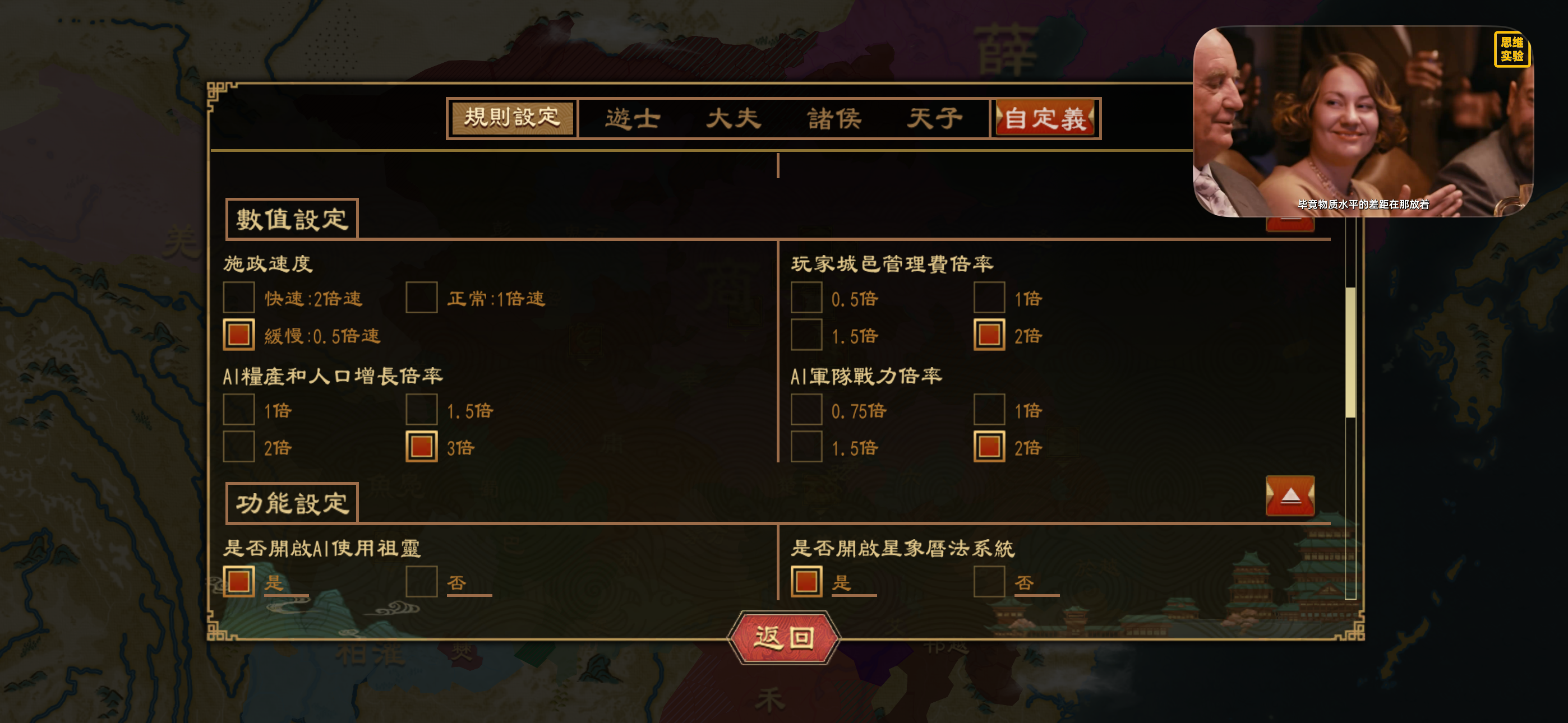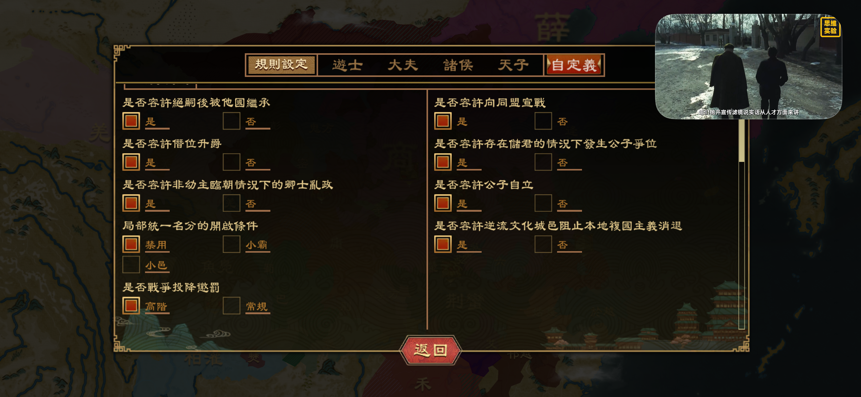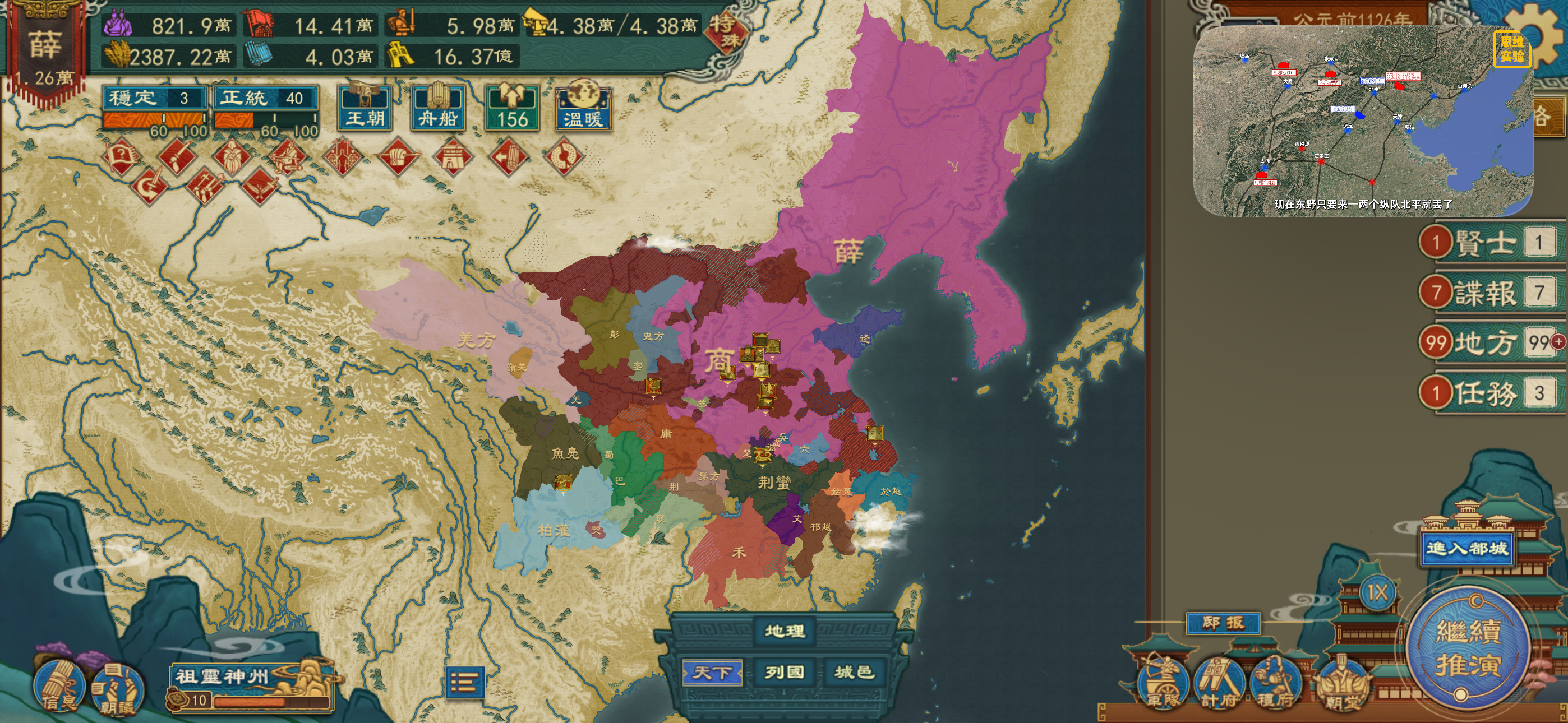 什么大功能大逻辑就不指望了,免得又出什么冰期暖期、年龄段1、谋略动画开关按钮,开关放在游戏设置或战斗页面都可以,用上兵不厌诈每次都要被硬控十几秒2、战争名分显示激活条件,统一四海消除祸患局部统一时有时无,不找客服问还不知道规则3、官员拔擢取消秩级限制,现在城邑官和朝臣间隔几十级根本提不上去4、像学派推演一样做自动祭祀、自动枢机守卫,像求学计划一样做一个自动荐贤、自动任官,每年都要弹窗太累人