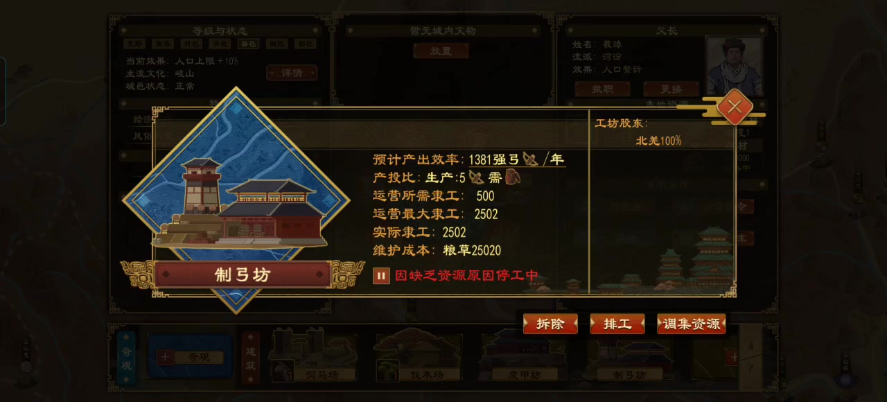 由于国内缺乏生产强弓所需要的漆胶,所以我就去其他国家购买了一些。但是在实际的排工中发现,除了国都的制弓坊能正常排工生产外,其他城市的制弓坊都缺乏原料。 如视频所示,根据提示将国都内的漆胶迁移到其他城市,但实际发现漆胶一直没运达目标城市导致无法生产,不知道是什么原因。