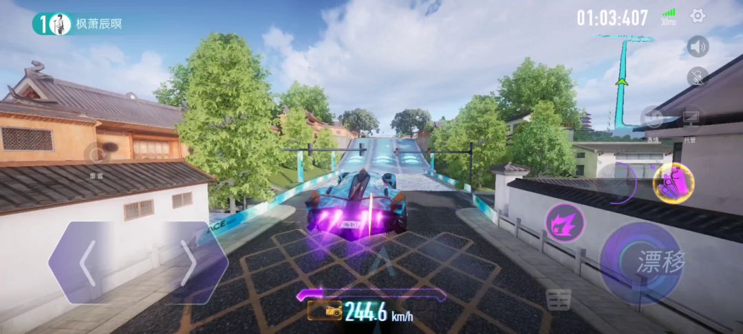 跃动苏堤逆向,用神剑号在这个大坡前用大招三档可以直接飞天跳过一个大弯