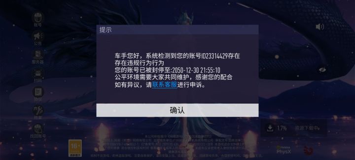 我账号已经被封了几年了,是周年庆,那会刚出个豪车蓝色的叫什么r9好像是那会被封的,没借号,没开挂,啥都没做,游戏还氪了千把块,甚至排位赛都很少打,大多时间开单人房自个玩,然后周年庆那会被封了,申诉没用,问就是违规,也没说违规的具体原因,客服也没有