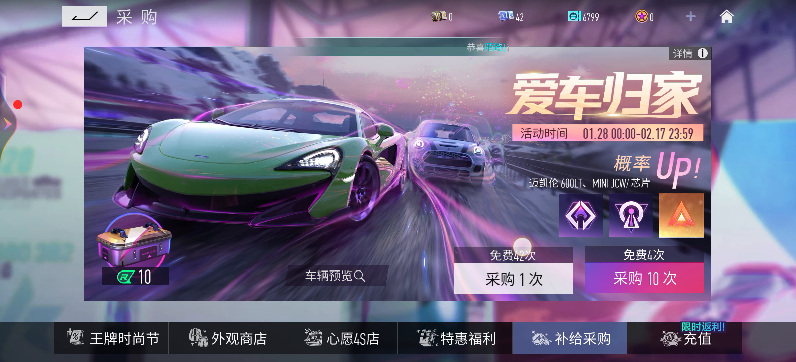 120抽出迈凯伦,运气跟平时来说算很好的啦,平时都是吃保底