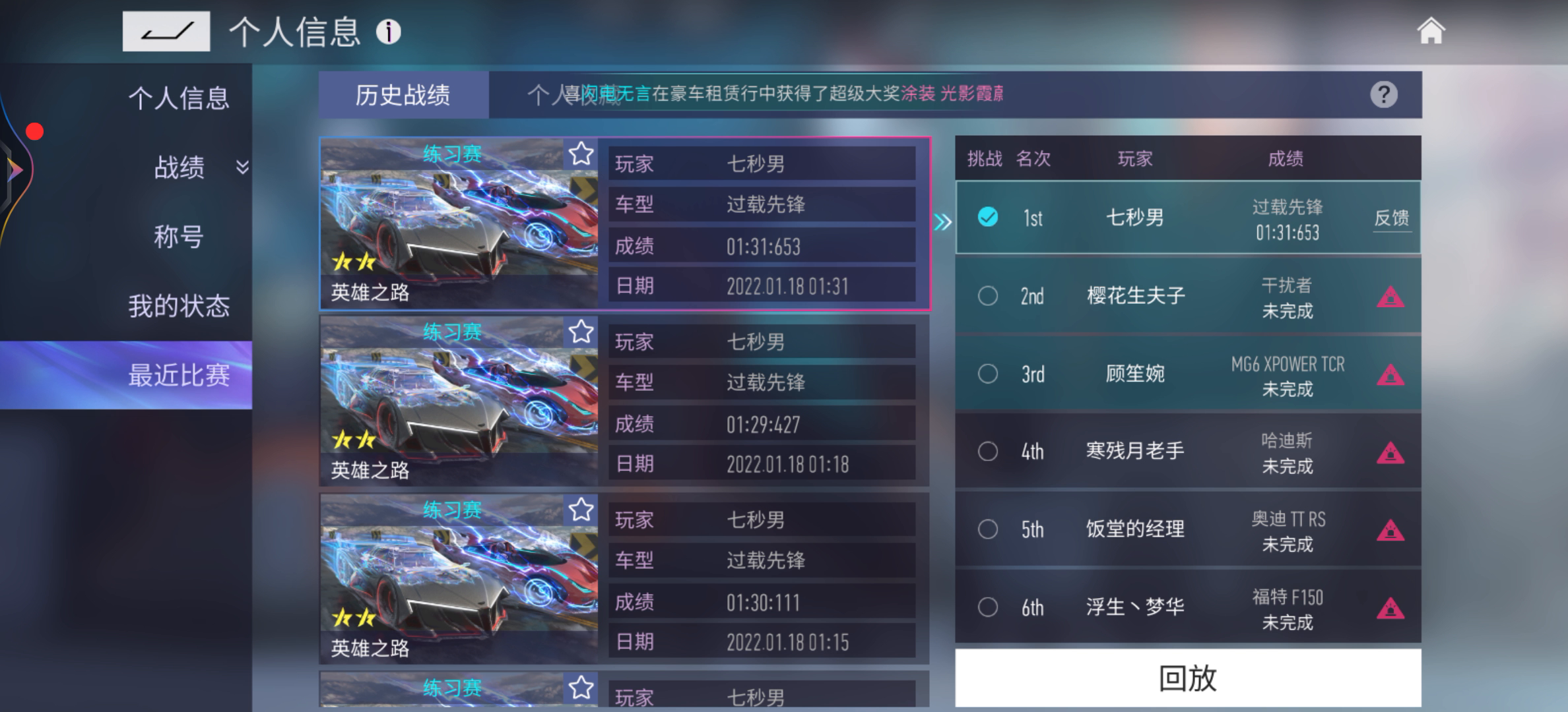 西理快过来,有人开科技,突然给我超了,我看回放,他一直在天上飞,就离谱。我开个小号练车容易嘛我,我哭了。。。。。