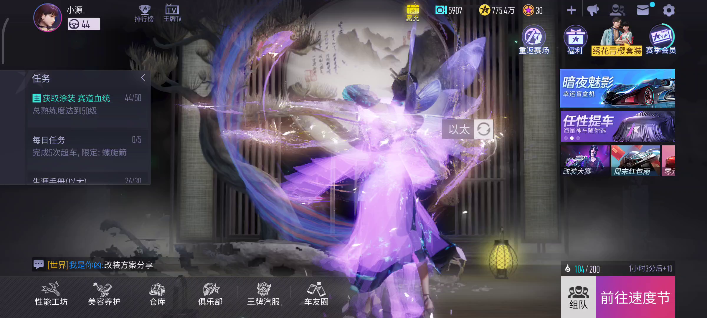 这个还是没特效的,我上午不是买了以太的涂装和轮胎,跑了一把赛车场,一局掉了八九次帧,本来开局掉帧就特难受,途中改掉,我人都快麻了……