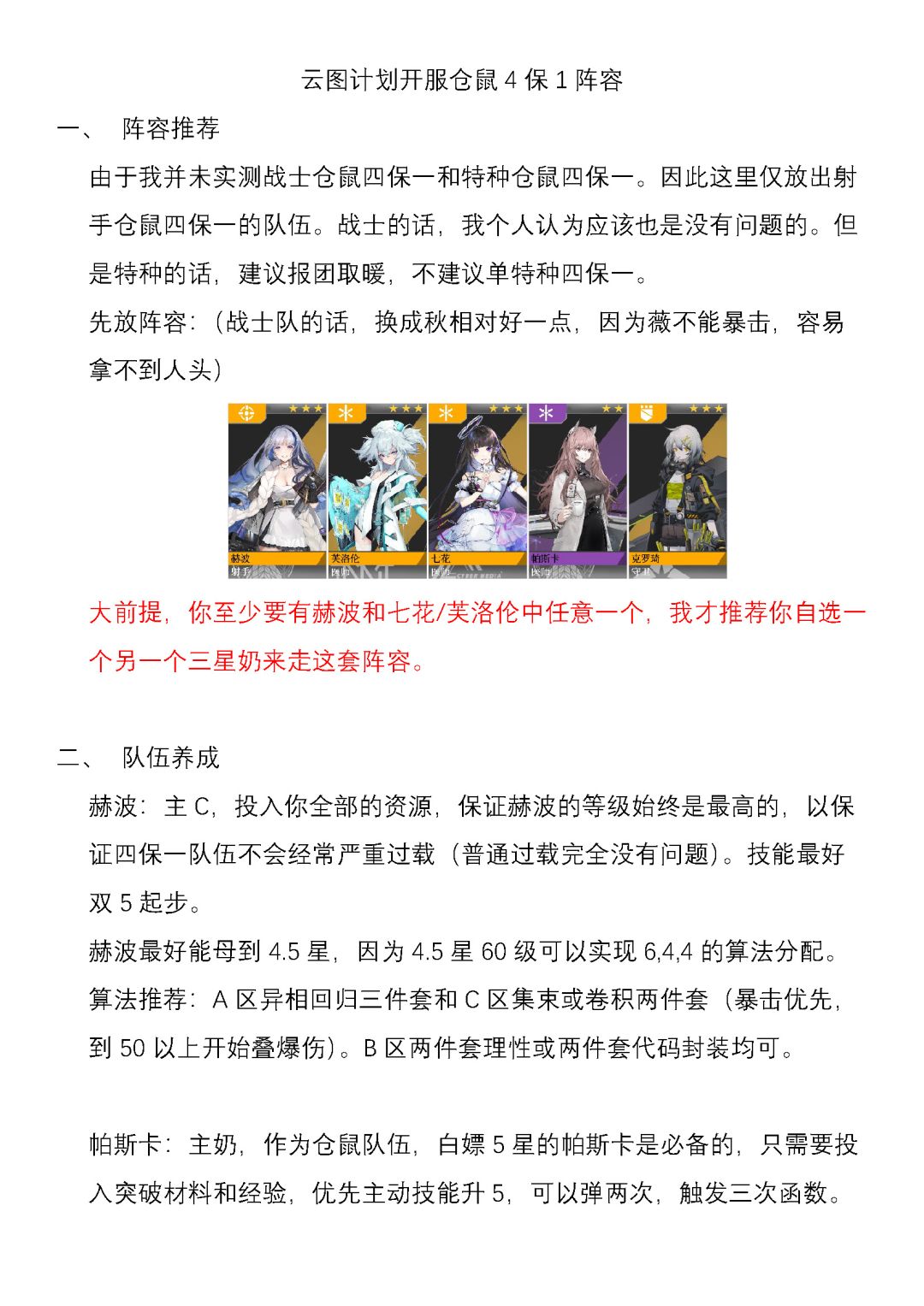 借这篇攻略顺便复盘一下我组开服的推荐榜,本来以为减伤效果削弱后效果会大不如前的(内测芙洛伦高难指定T0),激素大因为要掉血所以判断前期应该不太实用。 结果忽略了内测没有的助战系统,主线暗域无尽素材本都直接按快进键了这样激素和减伤都还是能在各种场合发挥很强的效果,保守估计也是有T1水准。 以下原文 作者:Miku大酱 一、阵容推荐 由于我并未实测战士仓鼠四保一和特种仓鼠四保一。因此这里仅放出射手仓鼠