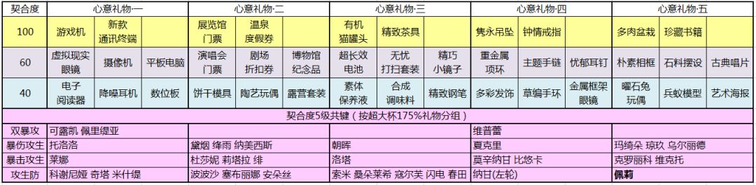 【自用表】好感礼物对应表(12/31更新) 作者 社区: 说在面前调度室升级思路主要看自己超大杯礼物对应人形礼物需求数量,来优先给谁普通内存条 由于调度室25升26开始需要30个复检材料(每周10个,每个新人形调度考核给4个),而同调数据1级需要150点,几乎等于后期每个版本最多升一级,导致过多的礼物在拉满主力之后对提升战力是没多大用的(不考虑5级送的2普抽的话) 现在每个版本(每3周)给的礼物已