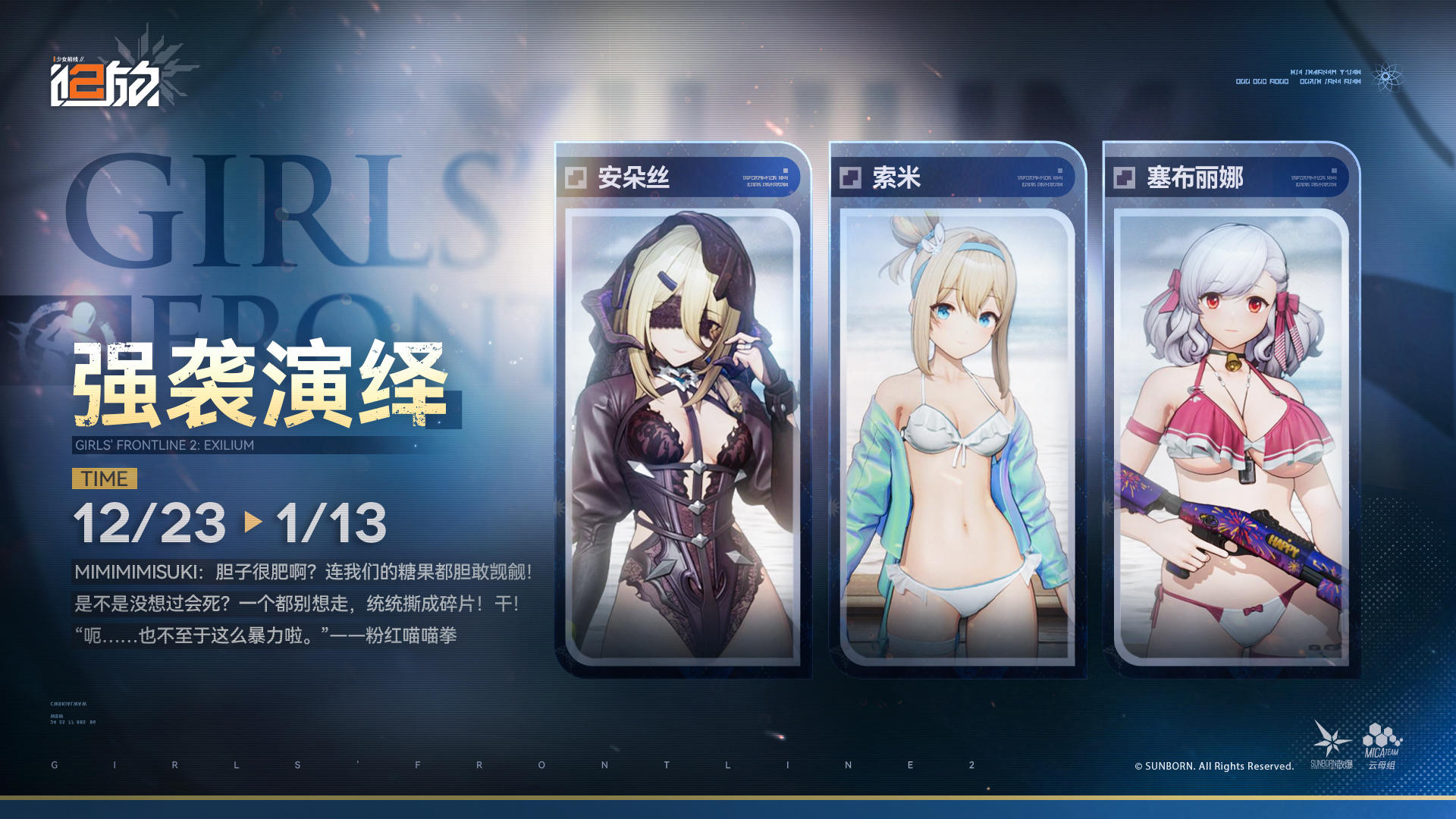 12月23日维护后,版本活动【铸碑者的黎明·下篇】正式开放! ♦ 二周年活动开启,参与活动累计可获取100+抽卡资源,更有免费精英人形等福利同步开放 ♦ 精英人形「夏安」&精英武器「夜行豆蔻」上线 ♦ 全新外观夏安<衣装·青涩夜会>&可换装部件版本更新后限时折扣上架 ♦ 全新外观索米<衣装·雪兔献礼>版本更新后限时五折折扣上架,另有可换装部件可供挑选 ♦【铸碑者的黎明·下篇】【强袭演绎】【异维探渊