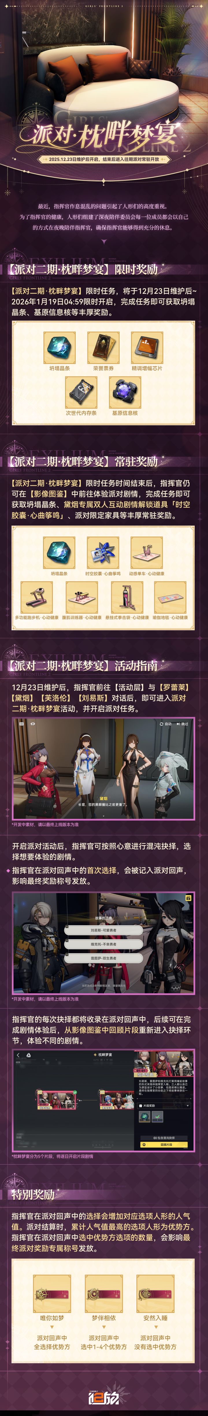 12月23日维护后,版本活动【铸碑者的黎明·下篇】正式开放! ♦ 二周年活动开启,参与活动累计可获取100+抽卡资源,更有免费精英人形等福利同步开放 ♦ 精英人形「夏安」&精英武器「夜行豆蔻」上线 ♦ 全新外观夏安<衣装·青涩夜会>&可换装部件版本更新后限时折扣上架 ♦ 全新外观索米<衣装·雪兔献礼>版本更新后限时五折折扣上架,另有可换装部件可供挑选 ♦【铸碑者的黎明·下篇】【强袭演绎】【异维探渊