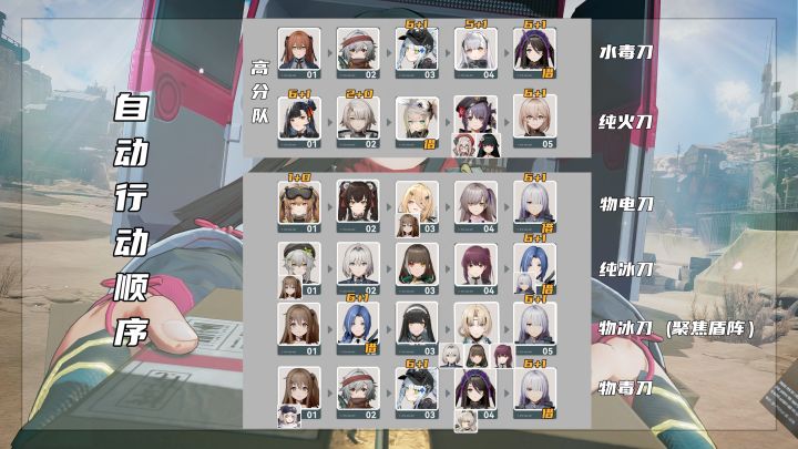 观众老爷们大家好,欢迎收看樱花版本的尘烟前线一图流攻略,这里是ReTempest。这次的会战是火和毒属性天气,那么高分队自然就是水毒刀和纯火刀了, 如果有满椎的威玛希那完全可以使用下方的物毒刀,但是水毒刀有一个好处就是可以解放威玛西娜和幼熙去出第3刀。水毒刀需要6椎可露凯再借一个满椎翡图萨就可以手操打满了,下方的纯火刀则更是夸张,仅需2椎维克托借满配秋桦同样可以手操打满,这里必须要吐槽一下樱花,