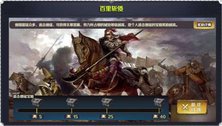 百里斩倭寇玩法是除了势力战之外,唯一能获得神兵材料的挖法。只有玩家所述的势力占领了城池之后,每天的21:00到第二天的19:00才可以进行百里斩倭的玩法,百里斩倭的怪物难度是根据挑战玩家的等级自动生成的。进入根据击杀敌军数量,可以领取不同档位的宝箱。