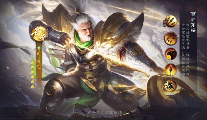 武将碎片入手方法 抽卡、八日登录、访贤玩法 武将定位 黄忠在历史上就是一位有名的神射手,其箭法举世公认,被称为五虎大将之一的黄忠,有着老骥伏枥,志在千里的志向,游戏里的她依旧是一位AOE十足的优质主C型射手。 黄忠的技能大多都是输出极高的AOE伤害,天赋技能箭斩流星可以在短时间内打出大量AOE,前中期推图,刷副本都卓有成效,最合适的不二之选。 黄忠的技能大多数是通过增加自身的攻击效果来提升输出,如