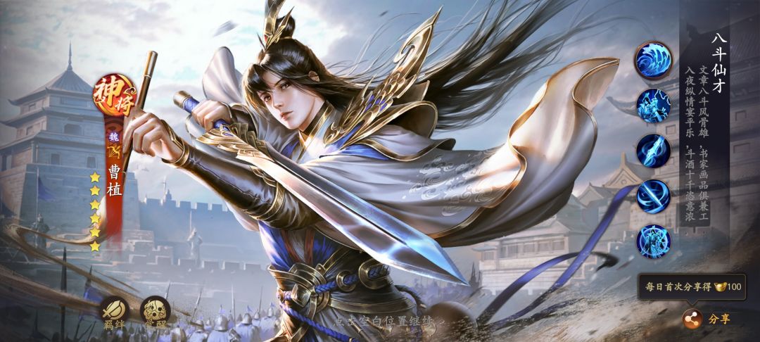 愿欲一轻济,惜哉无方舟 闲居非吾志,甘心赴国忧 *武将原画 *武将过场动画 曹植是一位拥有大范围群体伤害技能、能够施加寒霜效果、召唤分身的远程范围伤害型武将,并且在场期间可持续为友将回血 *武将培养画面 研发过程录制,最终以游戏内为准 南国有佳人,容华若桃李 朝游江北岸,夕宿潇湘沚 【技能详解】 主动技能——洛水感怀 曹植思若泉涌,在指定位置召唤出5处半径6米、持续10秒的漩涡,漩涡范围内所有敌方