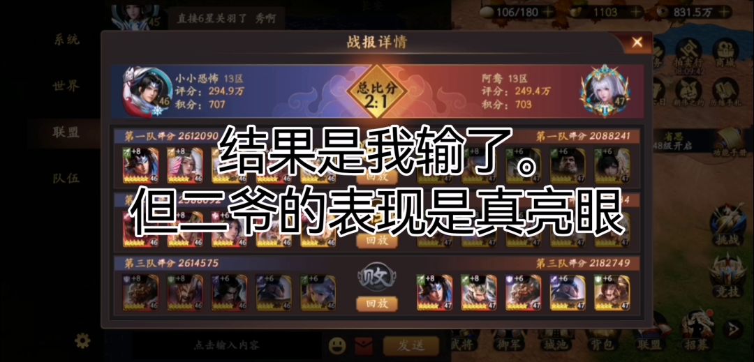 场景在pvp,我2:1输了,唯一赢了的一局就是视频里这把。 关羽是红色方,视频30s开始显神威,1v5极限翻盘。最后附有数据统计