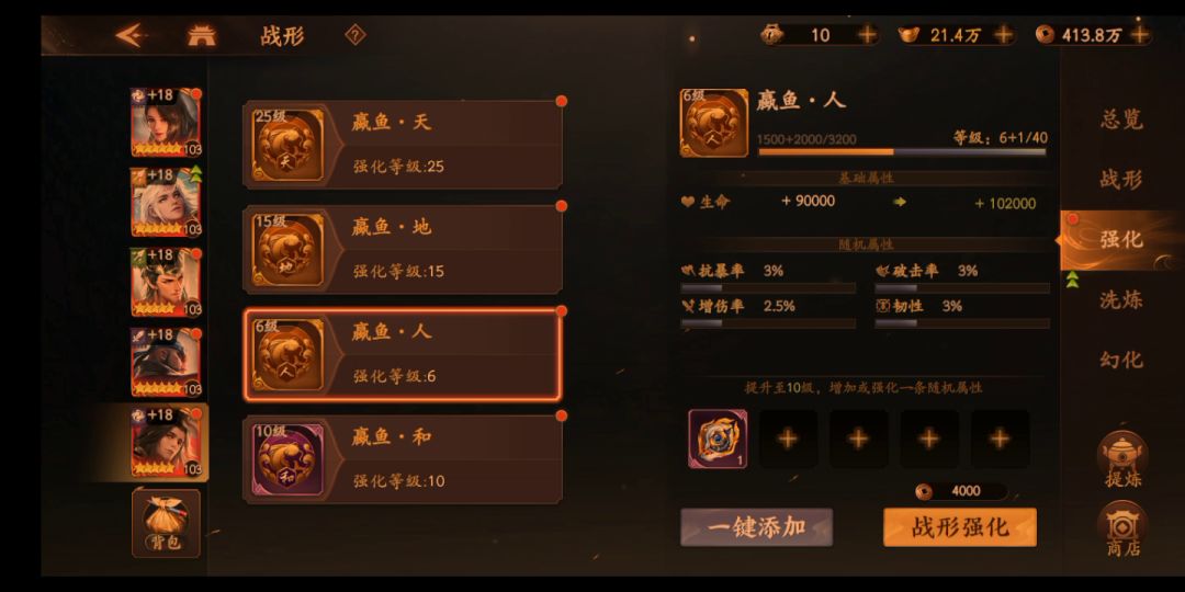 建议提高战形等级上限改成无上限, 或者强化的时候能叠加那些石头,或者能分解绿色蓝色紫色战形, 或者强化提炼可以返回铜币! 别问我为什么不把资源用了, 主c 冷却没洗完,全部存着等红鱼