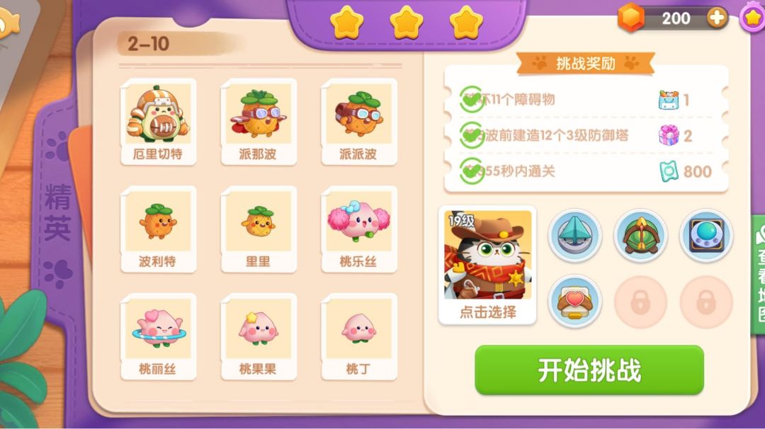 一、喵咪技能要求 1.精英关的难点在于把十几波的怪物,加起来分在五波中,导致怪物量非常多,所以开始时就需要金币支撑塔的建造 所以我们需要使用能清理障碍的技能,致使很快得到金币,推荐暴风雪、闪电、陨石。 (如果没有这几种技能得喵咪也可以使用资源补给,达到差不多的效果。) 2.接下来使用的是喵咪瑟西 友情提示: (不用管喵咪等级,战斗技能得伤害只跟星级有关系哦(´-ω-`)) 二、塔配置等级 很多小伙
