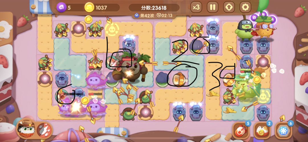 我研究了一个极限打法,用那个复活币复活一次,运气好可以打到2w6,无道具,不用钻石buf ,买喵卷buf 不带猫爪。需要幽灵塔,减速塔,弩塔,乌云塔满级还有奶茶塔满级。但是我打到两万5多一点点死了,时间还有一分多钟,就很尴尬了[捂脸][捂脸][捂脸]不死的话极限2w6。 具体思路还是速塔,开局在这三个位置做三个满级奶茶塔,可以守住第一波,然后拿buf ,有没有节能都不重要,因为这一套很便宜,第一波