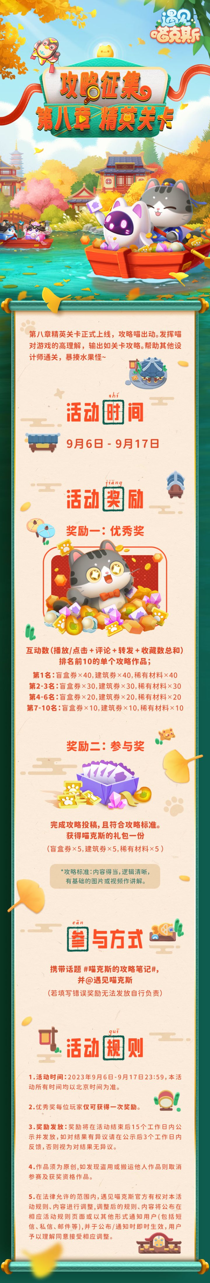 【攻略征集】第八章精英关卡等你挑战第八章精英关卡正式上线,攻略喵出动。发挥喵对游戏的高理解,输出如关卡攻略。帮助其他设计师通关,暴揍水果怪~【活动时间】9月6日-9月17日23:59【活动奖励】奖励一:优秀奖互动数(播放/点击+评论+转发+收藏数总和)排名前10的单个攻略作品;第1名:盲盒券*40,建筑券*40,稀有材料*40第2-3名:盲盒券*30,建筑券*30,稀有材料*30第