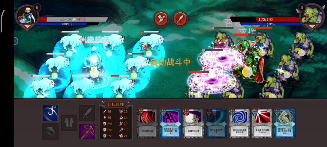 我打不死boss,boss打不死我。一开始我被打成半血,开始可以用召唤3只羊的技能,然后给全体上盾,然后抽空主动技能单体攻击boss一下,重复几次后,我带了8只盾越来越厚的羊群殴boss,然后boss被打到半血,也开始无限求援喊小弟,最后就变成了这样一种无限循环,谁呢打不死谁。这游戏设计的是个啥???我看不懂了,就让我无限看他们循环?手动自动都一样,无解。