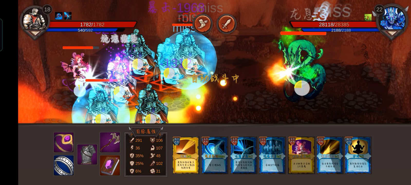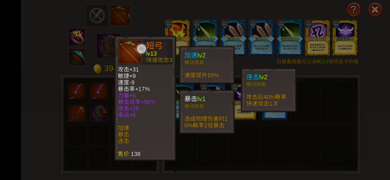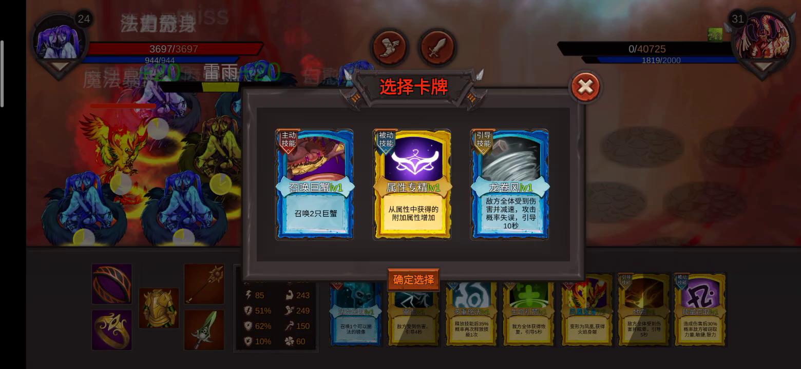 装备和卡牌需要搭配,魔力恢复,武器加成,这个游戏我已经打通关十几局了,卡片也快解锁完成,很简单的游戏。