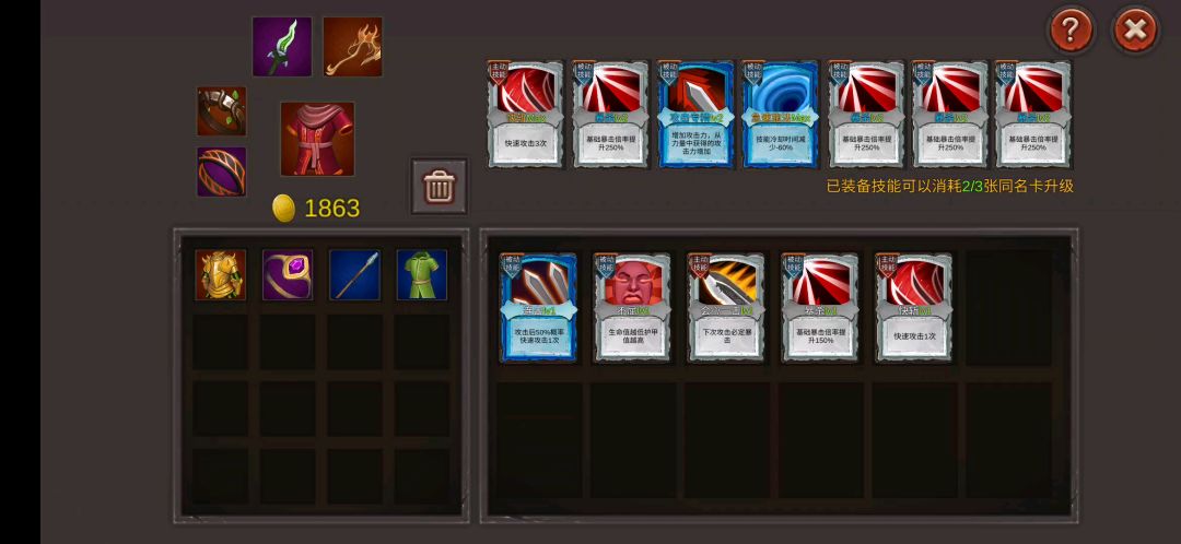尝试过多重通关方式 暴击流玩起来是最舒服的,全程随意秒怪,只有在原初那里会卡一会【我的武器是真的菜】 技能选择暴击,必定暴击,暴击倍率,真伤以及分身 属性优先幸运,敏捷,力量,遇到商店就买药,以及去捐款换敏捷,装备菜就行 装备方面,随便了
