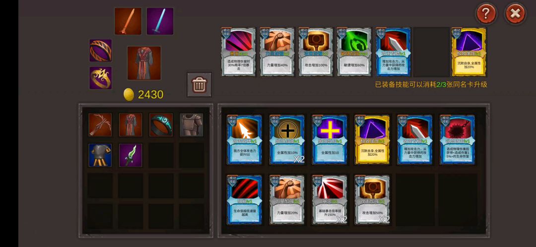 前期第一关打boss相对会物理平A流弱势一点点,这个时候护甲和cd都没起来,伤害和坦度都不够给力,所以前期用快速攻击武器或者火焰护体过度。有了盾击,护甲专精,力量强化以后,就可以拿双盾了,盾和衣服的词缀首选护甲,其次暴击,戒指补幸运和暴击。