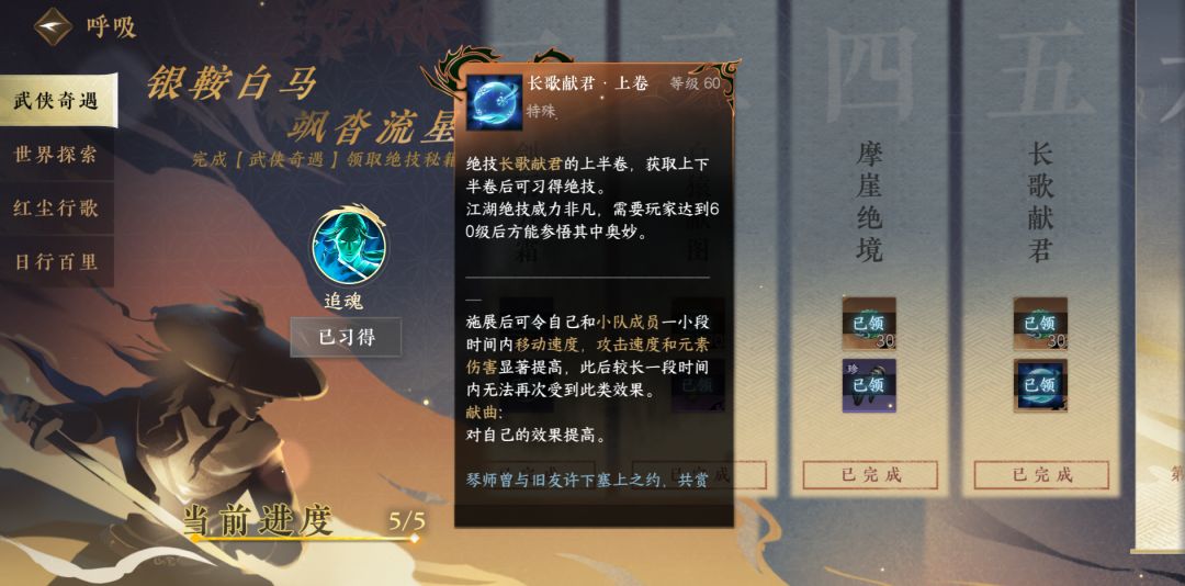 01 第五日必做 1)第五日主线(尘与蝶)。 2)完成呼吸里面【武侠奇遇】第五日的【长歌献君】任务,获得上卷,和昨天攻略的下卷合成完本,另外进度5/5的本门绝技不要忘记领取。 3)通关日常本【水啸钱塘】并领取首通奖励。 4)新增偷师系统,新增绝学系统。 5)获取独珍项链【诛邪之心】(获取方式在下方)。 6)盈玉令商店兑换3个金色内功 7)世界BOSS只看打的次数,不看等级可以打了 02 装备提升 一