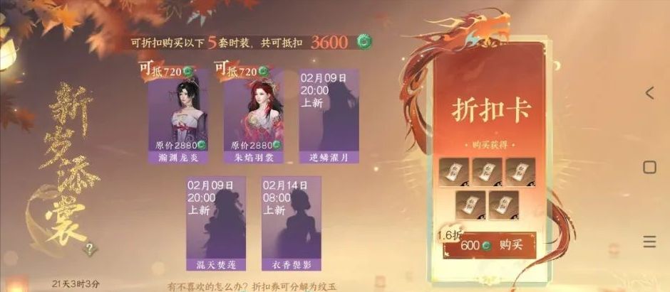 春节时装购买方案: 注:只是个人的浅见,不一定是最好的,还是需要结合自己的实际情况。 白嫖党: 白嫖党玩家可以选择68块钱跟6块钱的时装,在今天(2月2日)的签到可以获得1张500代金券,再叠加上1张150代金券,入手只需要3块钱。 白嫖党纹玉获取: 参加1亿纹玉瓜分的活动,带小芽玩家、回归玩家、或者师徒组队(/或者双人模式)打副本可以获得雨露点,4000点雨露预计可以获得120+的纹玉(参考上一