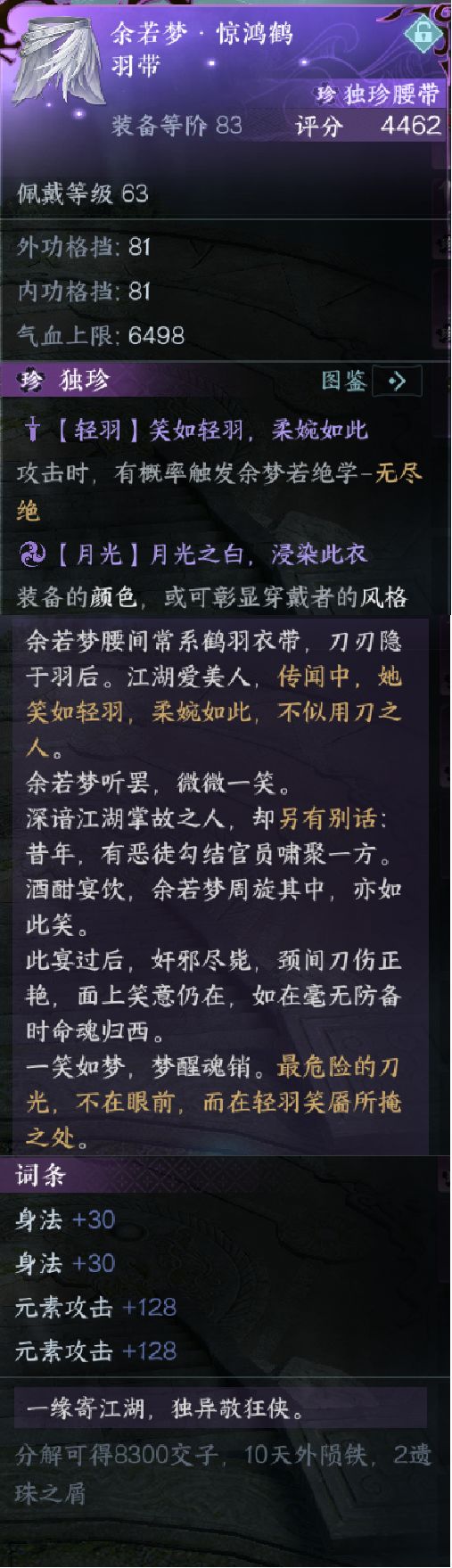 逆水寒新年版本流派试炼的3件装备,严格算来差不多是4件。至少增加了1000点左右的元素与破防。好好好我破防堆到2400了你不会告诉我元素流觉醒了把 首先是老一装备惊鸿鹤羽,全新的元素流装备,总共60点的身法,256的元素攻击,装备还附带技能有概率打出碎梦的无尽绝技能,这副本碎梦副本技能改被动加命中加会心再加元素,怎么看起来像是碎梦专属啊。 第二件装备不看龙吟根骨转破防更像是PVP装备 这件注意了,