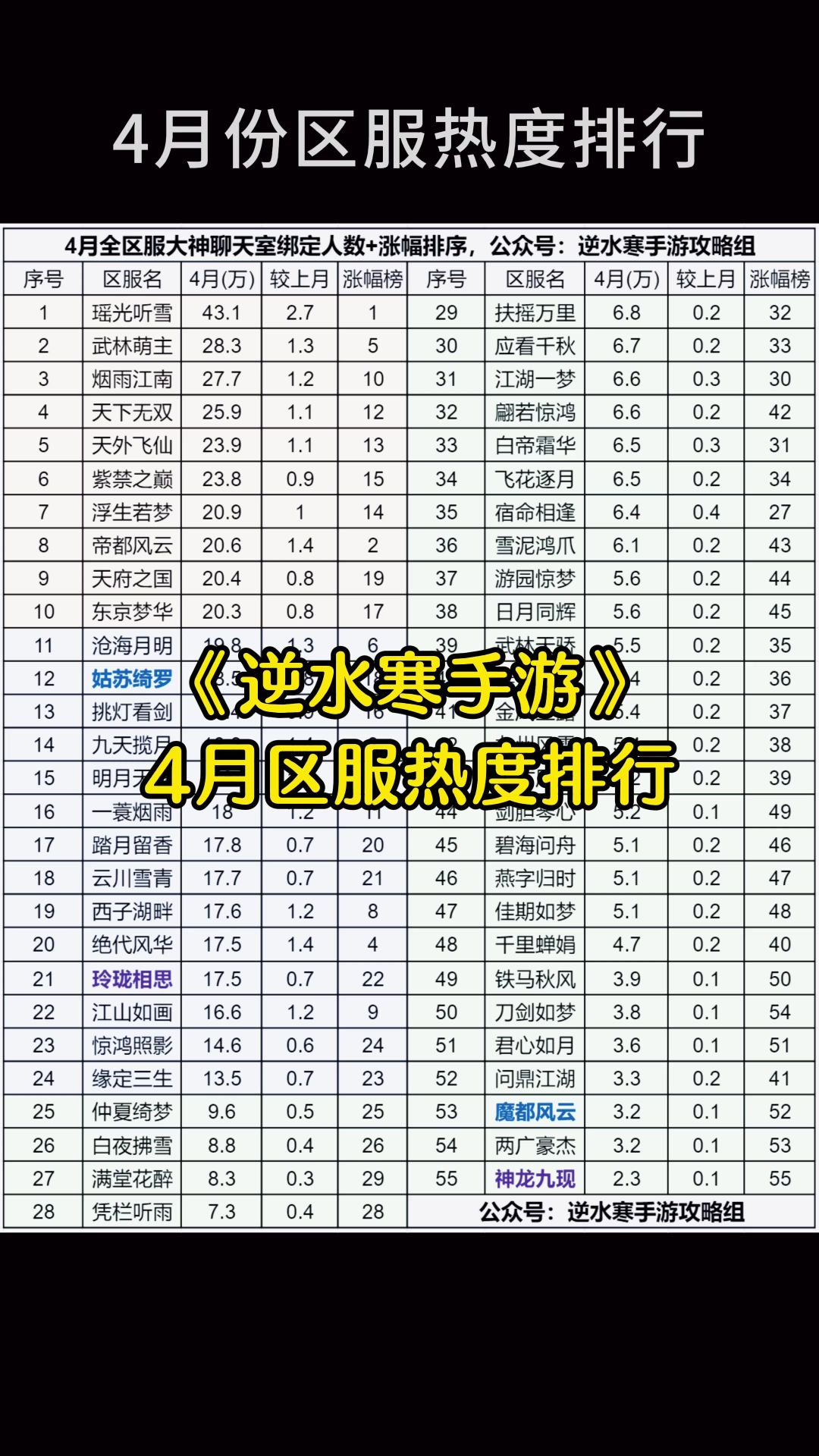 【逆水寒】4月区服(服务器)热度排行!