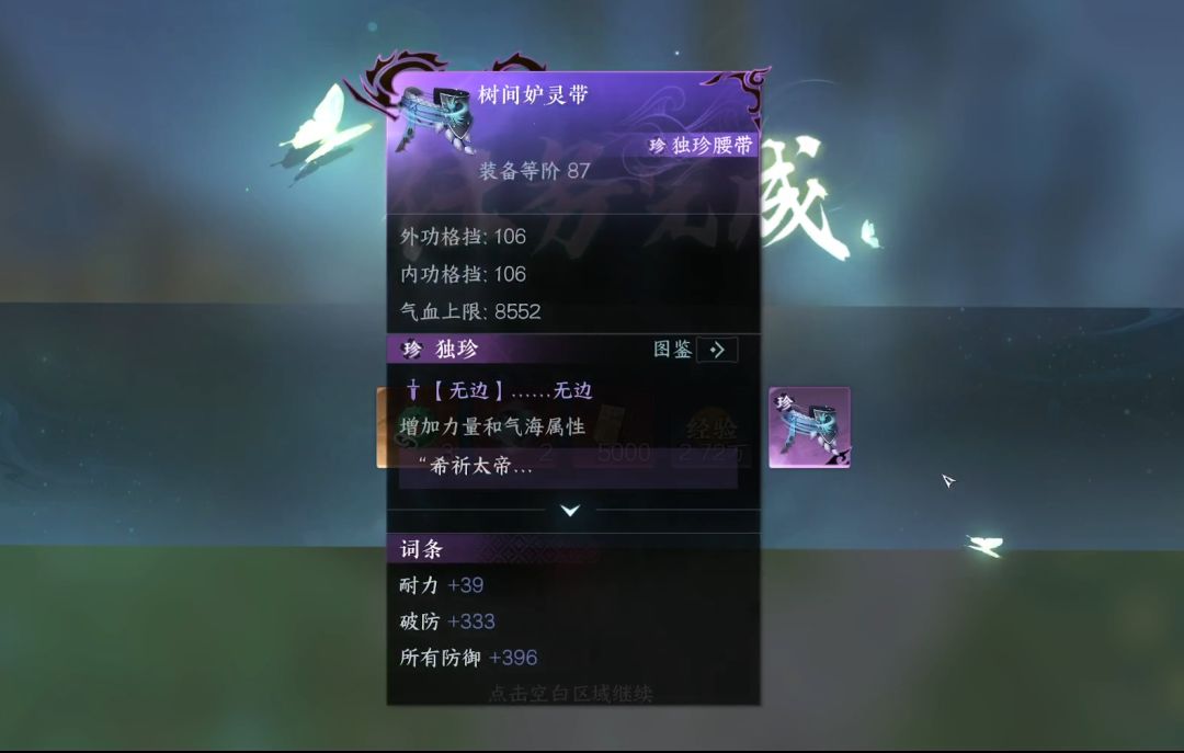 必拿独珍紫装、金色内功,大幅提升战力~ 1、装备名称:黑衣人.镜天函盔 坐标:雁门关 武安村395,853 获取方式:【注意,只有晚上才能拔剑】找到地上的剑点击查看,击败神秘高手就能获取51级高战力头盔 2、装备名称:叶雪青.桃花香、无情.步月靴 获取方式:点开呼吸-红尘行歌,第三天会有选择NPC任务,选叶雪青会掉落54级独珍腰带;选择无情会掉落46级独珍鞋子【第一个任务完成,点击左上角,选择全部