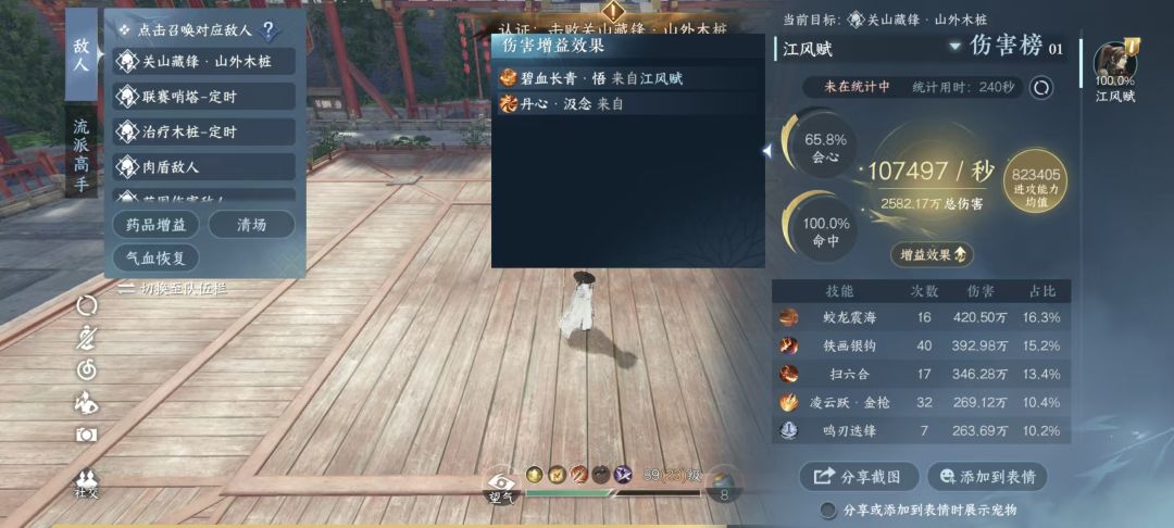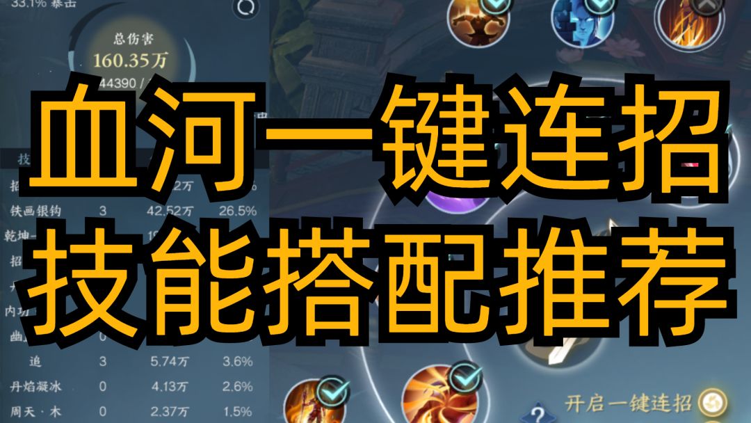 大家好,本期内容给大家带来的是血河一键连招的技能搭配推荐,秒伤不含绝技,怎么带技能最舒服! 一键连招起手:心眼无量+打虎一式起手,乾坤一掷后接追,然后开始一键连招! 测试时间都是30秒,测试的时候都是一套内功,一样的一键连招,多次测试选最高伤害的一次为图! 1.摄神追命 放【摄神追命】的时机很重要,如果要带,建议把【摄神追命】的自动施法关了,尽量在【铁画银钩】之前放,然后放完【铁画】开始【刺刺挑】