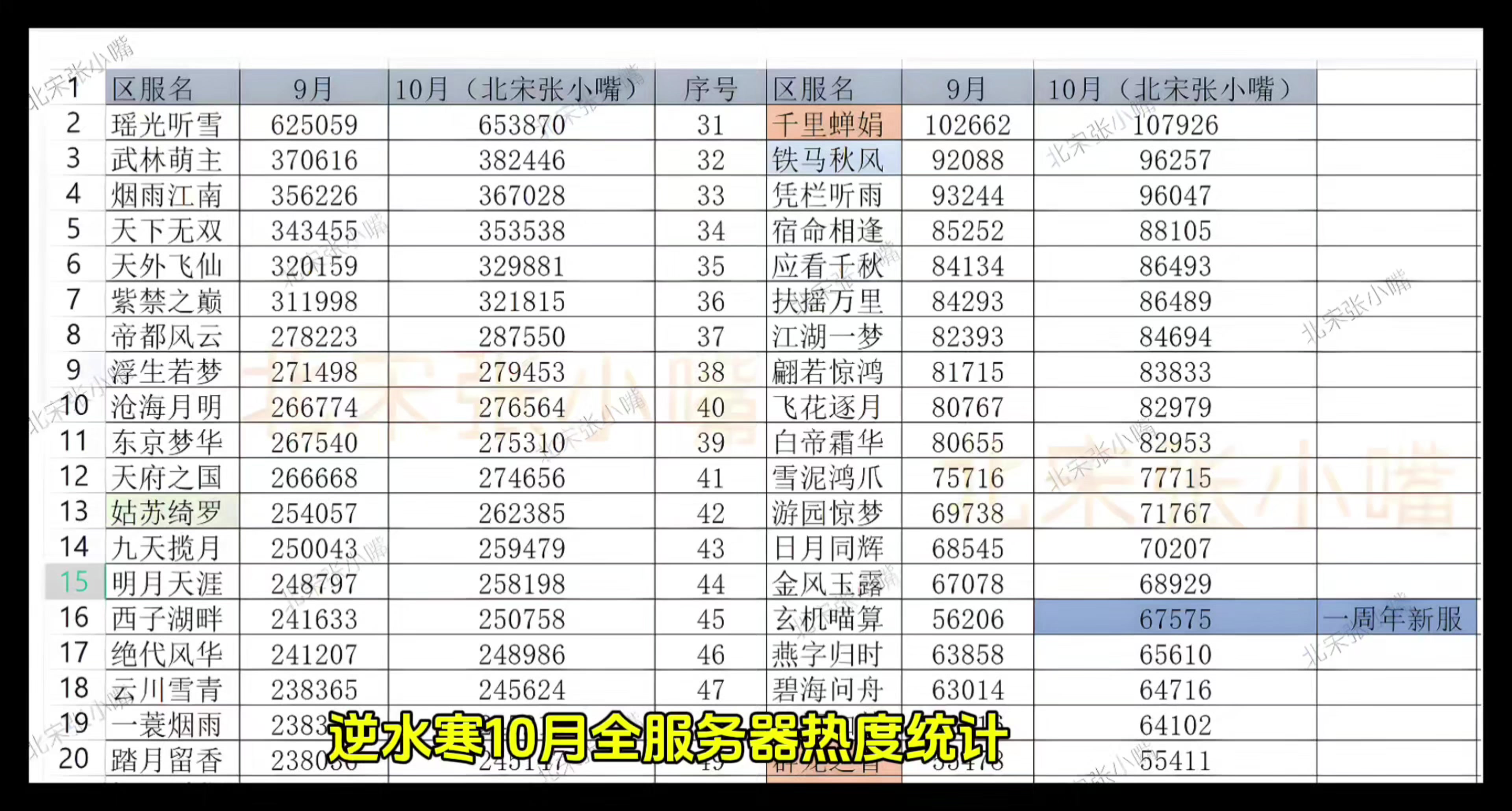 逆水寒10月全服务器热度统计,9月跟10月全服务器各区人数对比