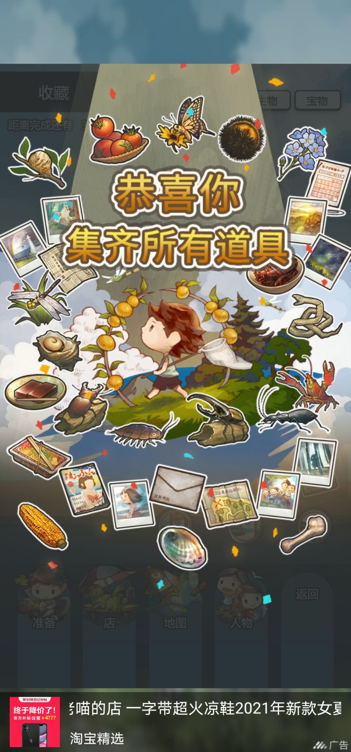 全部集齐!完结打卡!游戏挺咸鱼的,非常适合养老玩家(笑)有一点点像旅行的青蛙,不需要氪金,可以根据需要看一下广告,会有小奖励。