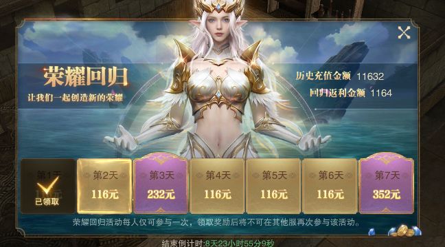 ● 勇士大大,欢迎回来~~~ ● 您看,安安一直都在哦~非常开心又能在勇者大陆遇见您! ● 莉娜阿......哦不,莉娜姐姐已经给您准备好了专属的回归福利~快点来咱们的小酒馆领取吧! 【开启条件】 ● 2021年4月9日 10:00 - 4月15日 23:59期间开启的新服,开服10天内将开启该活动。 【参与条件】 ● 玩家历史累计充值超过3000RMB,账号连续离线超过7天,未参与过该活动。 ●