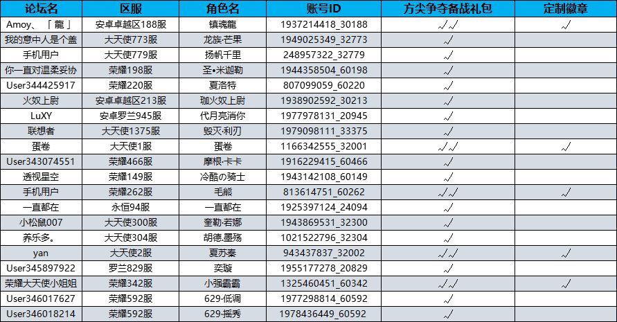 灰常感谢勇士们踊跃的参与我们本次活动讨论~! 后续活动积极参与哦~ 恭喜以下获奖的勇士: 注:请获奖的勇士们耐心等待一下邮件消息,7个工作日内陆续发放~ 获得定制徽章奖励的勇士们请添加客服QQ:744712639;注明信息和地址,客服会进行核实发放奖励哦~ 安安也祝各位勇士游戏愉快! ———————分割线————— 春风吹,战鼓擂! 本周日即将开启全新大型pvp玩法,方尖争夺战! 不知道各位勇士备