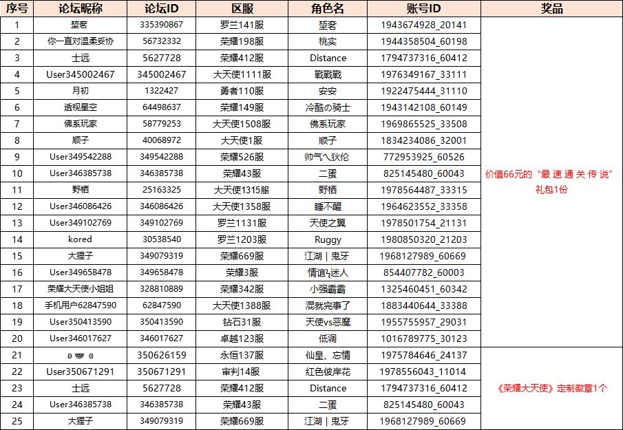 开奖啦开奖啦~各位勇士大大翘首以待的《荣耀大天使》大型活动终于开奖啦!咱们快来看看究竟是谁获得大奖吧~ 本次获得【拼速度】奖励的勇士如下: 本次获得【拼运气】奖励的勇士如下: 本次获得【拼实力】奖励的勇士如下: 恭喜以上获奖的勇士!兑奖请添加咱们的兑奖QQ账号:744712639。由于某些奖品货源紧张,所以奖品将于活动结束后的20个工作日陆续发放,请耐心等待~ 安安在这里感谢所有参加咱们活动的勇