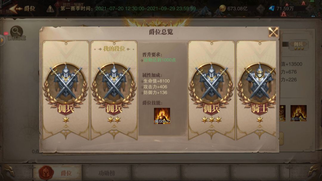 ● 远征中设置有爵位形式,爵位的价值在于均会获得对低于自己爵位的玩家伤害增加与受伤减少的效果,根据爵位的升级百分比依次递增。但携带能量上限的BUFF需要至少到达佣兵三星。下面我们来聊聊爵位的升级和用处。 一、爵位升级 ● 远征中爵位需要通过功勋来进行升级,以最初的佣兵为例,功勋达到0可以成为佣兵,达到1000可以晋升成佣兵一星,正式开始获得加成。详图如下。那么功勋如何获取呢。途径就是远征攻城和远征