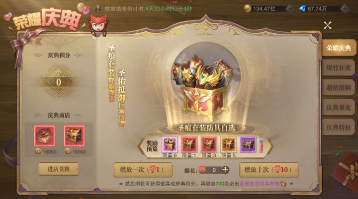一.活动入口点击游戏主界面右侧活动图标入口进入二.活动时间活动时间: 2022.5.6 00:00~2022.5.10 23:59:59且开服天数大于7天三.活动简介1.荣耀庆典【燃放烟花】消耗庆典烟花进行抽奖大奖有保底,1600次必出,同时限量抽取,达到抽取上限后不可再由本次活动抽取获得抽奖奖励中有庆典积分奖励,可用于庆典商店兑换道具【庆典商店】消耗庆典积分兑换商品,部分商
