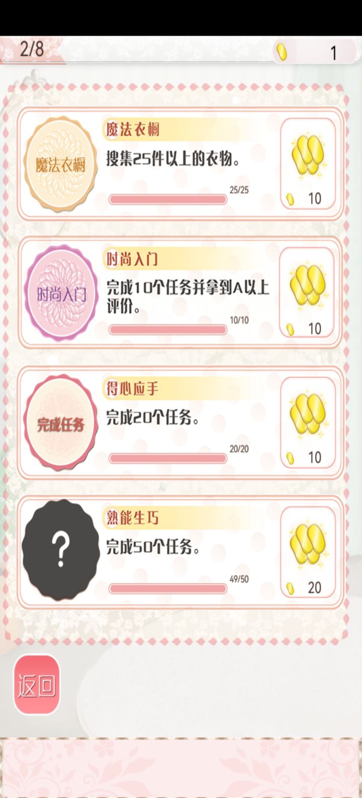 好了,这个任务其实是收集50件衣服,可惜的是我还剩一个金币的时候,把游戏卸载了重玩