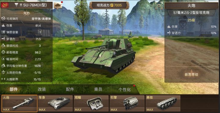 SU-76M苏联在二战中生产数量最第二多的坦克,战车的配置特别简陋,随车只有一挺战斗室机枪,战斗室的右侧内壁上还可以挂载一支波波沙41冲锋枪,这俩都是为了给车组提供自卫能力才加装的,驾驶SU-76M的坦克兵们并不喜欢这台车,给它起了很多糟糕的外号比如“сука”意为bitch,或者“сучка”意为little cunt,这些外号很大程度来源于战车的薄弱防御问题。类型:反坦级别:Ⅱ级获取方式