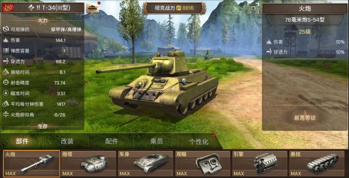 T-34坦克是一款苏联于二战前研发的中型坦克,在二战中被苏军大量使用。出现时德军几乎没有能对付这种坦克的武器,它的76毫米火炮也能够轻松击穿同时期德军的所有坦克。类型:中坦级别:Ⅱ级获取方式:23级解锁购买价格:140000金币三改满级属性