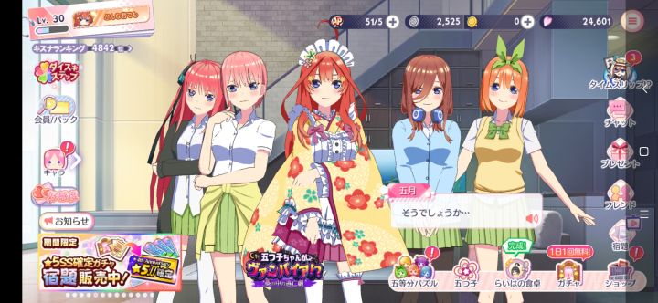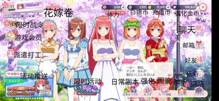 本作现在只有日服了,于是就只简单的写一下日服的入坑。日服是2020年10月发布的,大家都是冲着这个ip和老婆们来的,整个游戏大体上和漫画剧情差不太多。三玖天下第一,我推三玖一辈子。=下载方法=IOS:日服,可以转日区,搜索“五等分の花嫁”就可以了。安卓:找不到在哪下的话,。后续更新也一样=初入游戏=会有非常多的游戏资源需要下载,网络好的话,应该很快就能下完吧。网络好,本作直连好