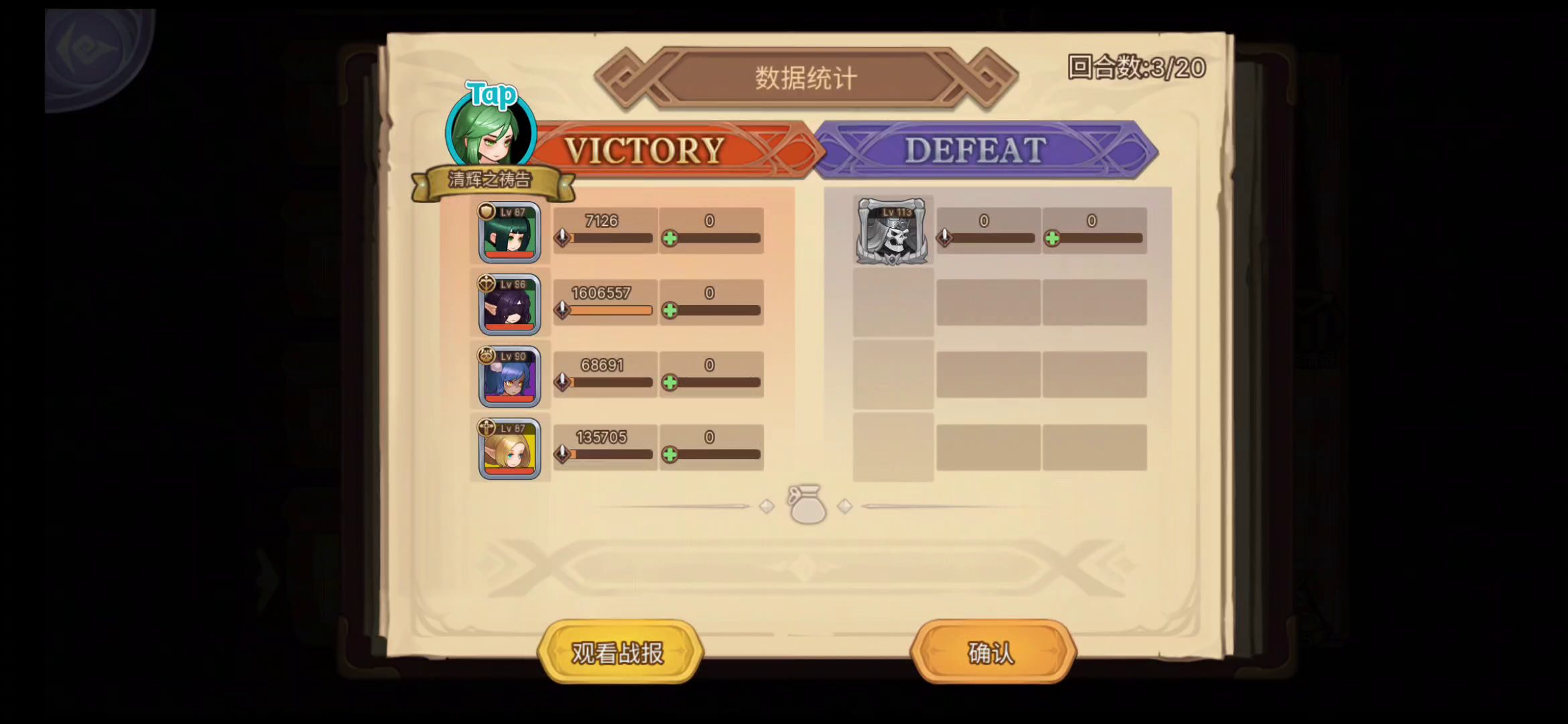 低练度只能靠弓两回合秒掉boss,修和圣无脑给弓buff,别管死活,巫师也可以带减防,2号位留给巫师因为boss第一回合必眩晕那个位置