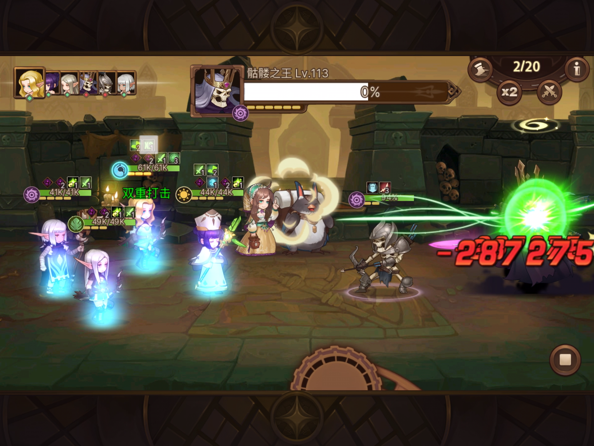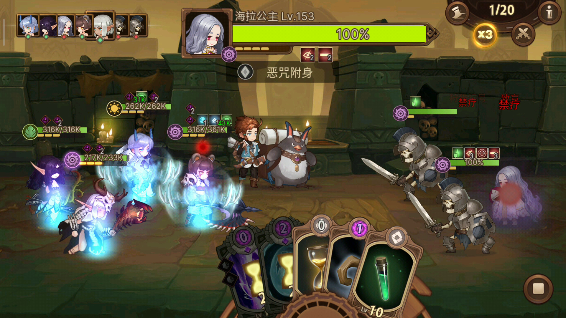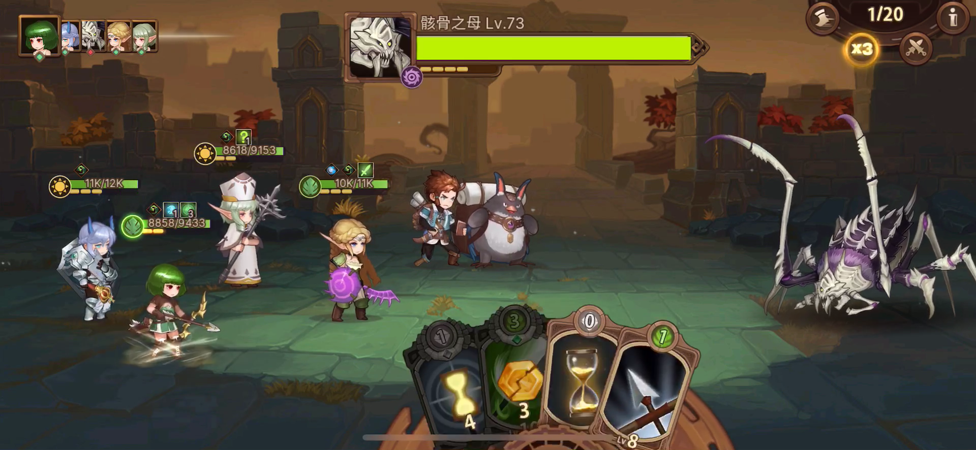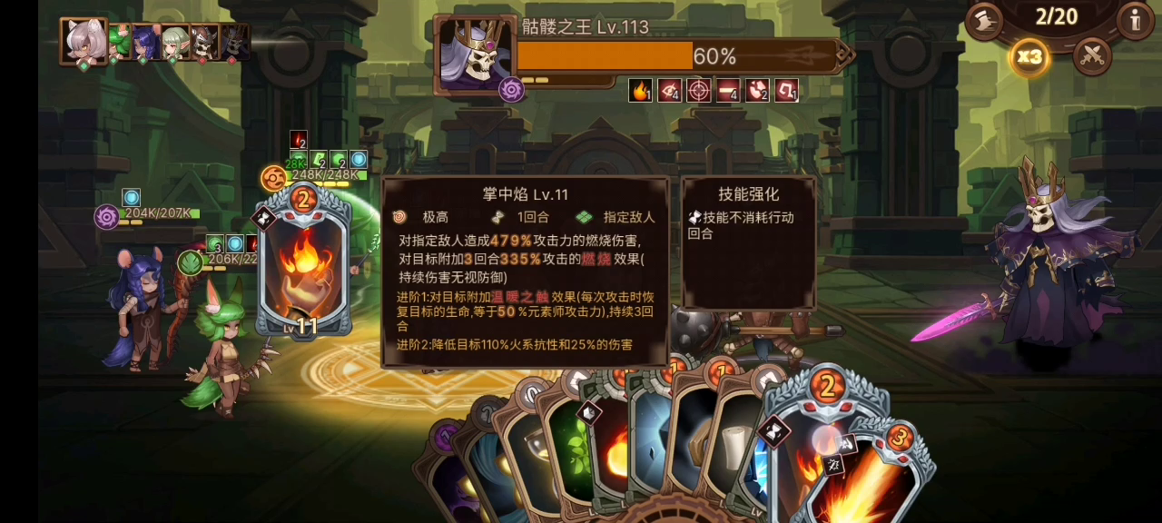 由于弓没给力的群攻技能,亲王关的杂兵一下就能秒我,这堵了我两天 刷防具。视频里主力没抽到连环箭,但抽到了不占回合的扭曲。 过了亲王后,骷髅王这个憨憨就是白给,第一回合还敢召唤杂兵? 哈哈 一波带走~