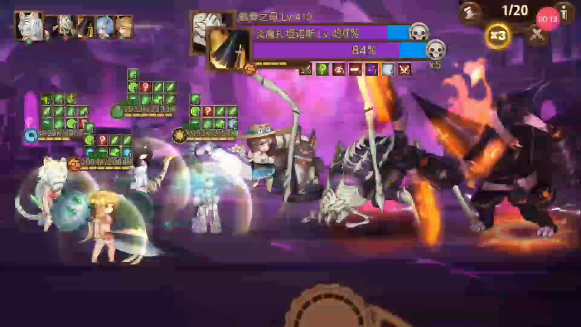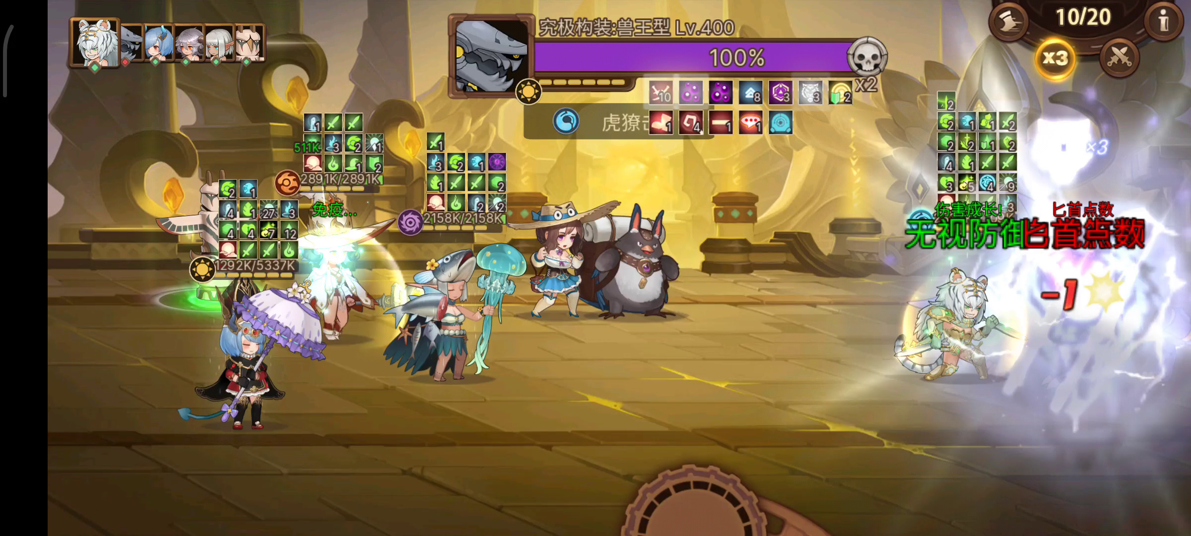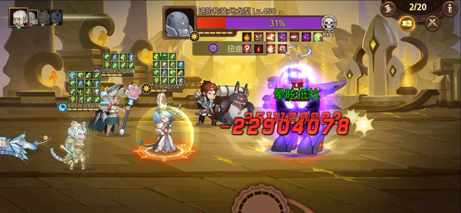11管血差点被吓到。这个还是510的boss追击技能团灭队友很吓人的😈。我打了两把,给大家一些技巧和思路:主要玩法还是叠毒叠异常,前排修女,后排放法师(别的工具人也行),中排输出,最重要的一点后排不要给无敌,让他有能力躺尸,这样修女不会被大鸟号一鞭子拽到后排,这样修女可以一直在前排扛伤害,剩下的就简单了,叠异常你们都懂得。我的输出白虎39w攻击(所有as中攻击最高的),赎罪13w,能打动,就是有点刮痧难受😖啊,还是叠异常舒服。