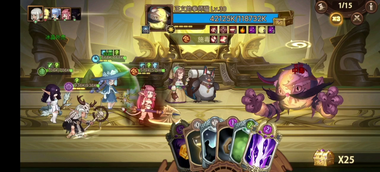 技能就4个大师,核心2个:致盲和恶灵,10回合轻松31箱子,谁说牛牛不肉的2333(性感牛牛不爬塔) 游侠换了武器涨到6万攻了,但是不再是主力了,可怜的娃