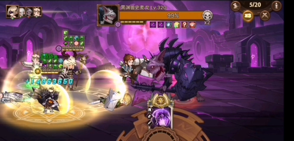 后悔没弄大师包扎,小怪层199开局就没中前排,没有了剑盾的无敌掩护和圣骑的无敌盾,爆裂弓一回合打不完反被摸头杀,退而用GBL弓冰戒,刷双冰冻+标记boss开局,终于两回合击杀,200层就轻松了,毒巫单刷通关,优秀哈哈!