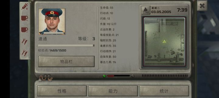 首先依旧得吐槽这傻*特工有动静不拿枪给他们突突了(눈_눈)。开局天赋:靶场粉丝+饕餮(+2耐力那个),能力全点自动武器,属性耐力扣一点给力量,其它全点敏捷。首先在基地把人物升到2级,把自动火器和近距离射击点了。详见[B站UP主:专收集uid:443945706]然后剧情对话选三(你的铜指虎吓不到我:要求6力量),就可以自卫,先手。往下走一格,左摇杆把光标移到背包上(防止误操变成走过去)右边