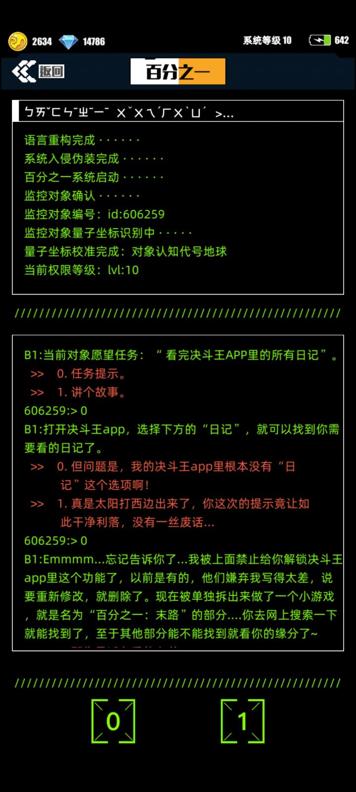 Q:“百分之一:末路”以及“百分之一:房树人”等这些冠名百分之一的小游戏是啥?什么时候上?A:首先“百分之一:末路”是“百分之一”里主要角色的独立故事剧情章节第一章。百分之一:末路也将在9月21号上线。大家可以看成是“百分之一”一个世界观下,不同时间段和不同视角下发生的故事。这样单独玩也完全不会有理解的地方。其次这段剧情本来是放在游戏本体里的,由于我们本体是竖版的,有很多老玩家说原来游戏里的竖版