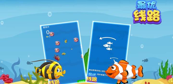 滑动屏幕,控制小鱼左右移动,移动中接触到另一只小鱼后,这些小鱼会粘住,粘住的小鱼数量越多,分数越高;在游走过程中会遇到大鱼跟一些障碍,如果小鱼接触到这些大鱼跟障碍物后会损失碰到的小鱼,直到最后一直小鱼死掉后则本局失败。